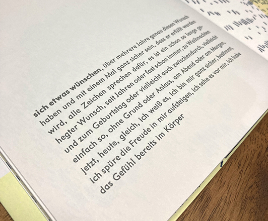 Cornelia Manikowsky schrieb zwölf Kurzprosastücke zu den kleinen und dann doch großen Momenten des Lebens, die von Muriel Zoe mit Lithografien illustriert wurden. Die gesamte Produktion – Bleisatz, Buch- und Steindruck sowie die buchbinderische Verarbeitung – erfolgte in der Grafischen Abteilung des Museums der Arbeit.